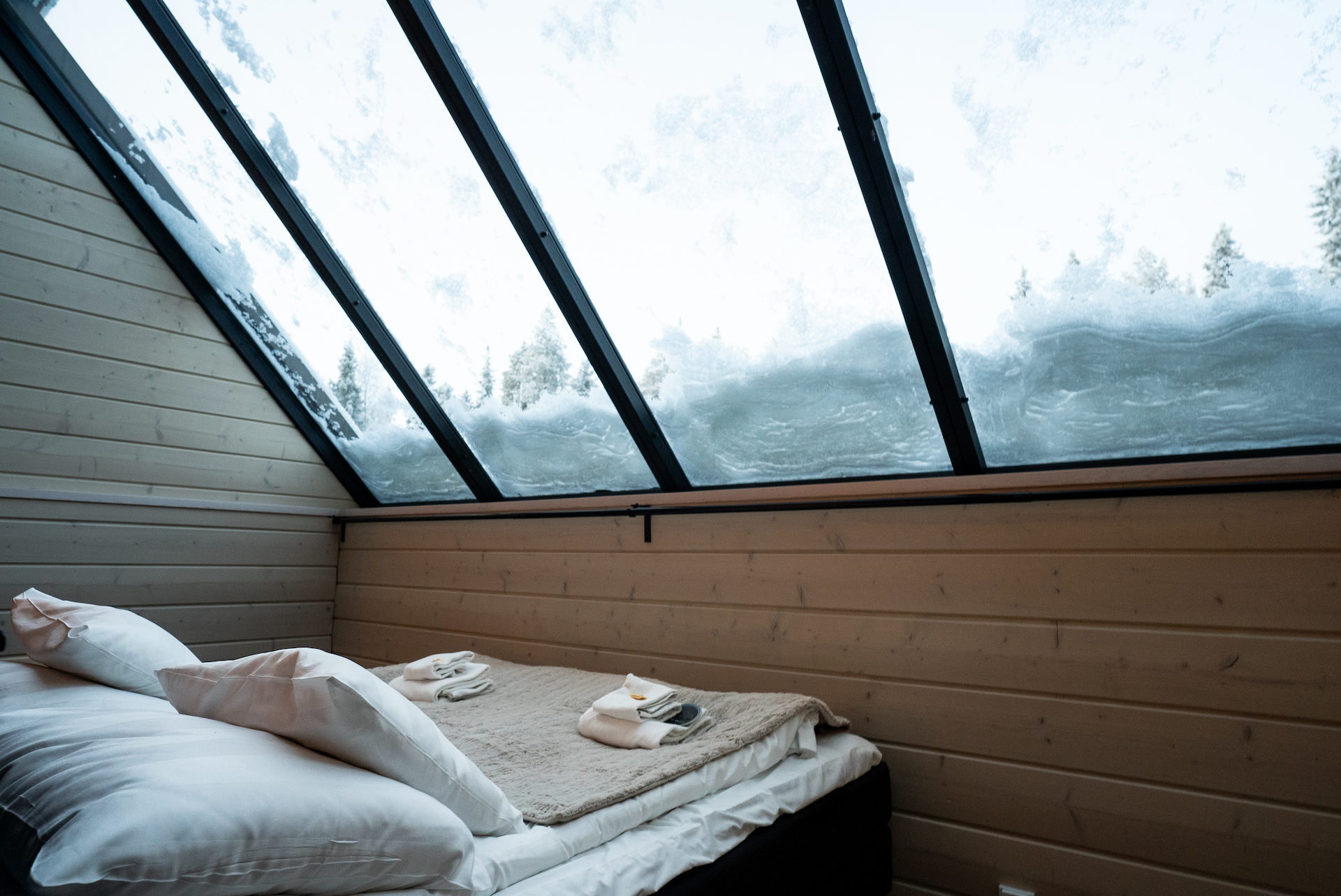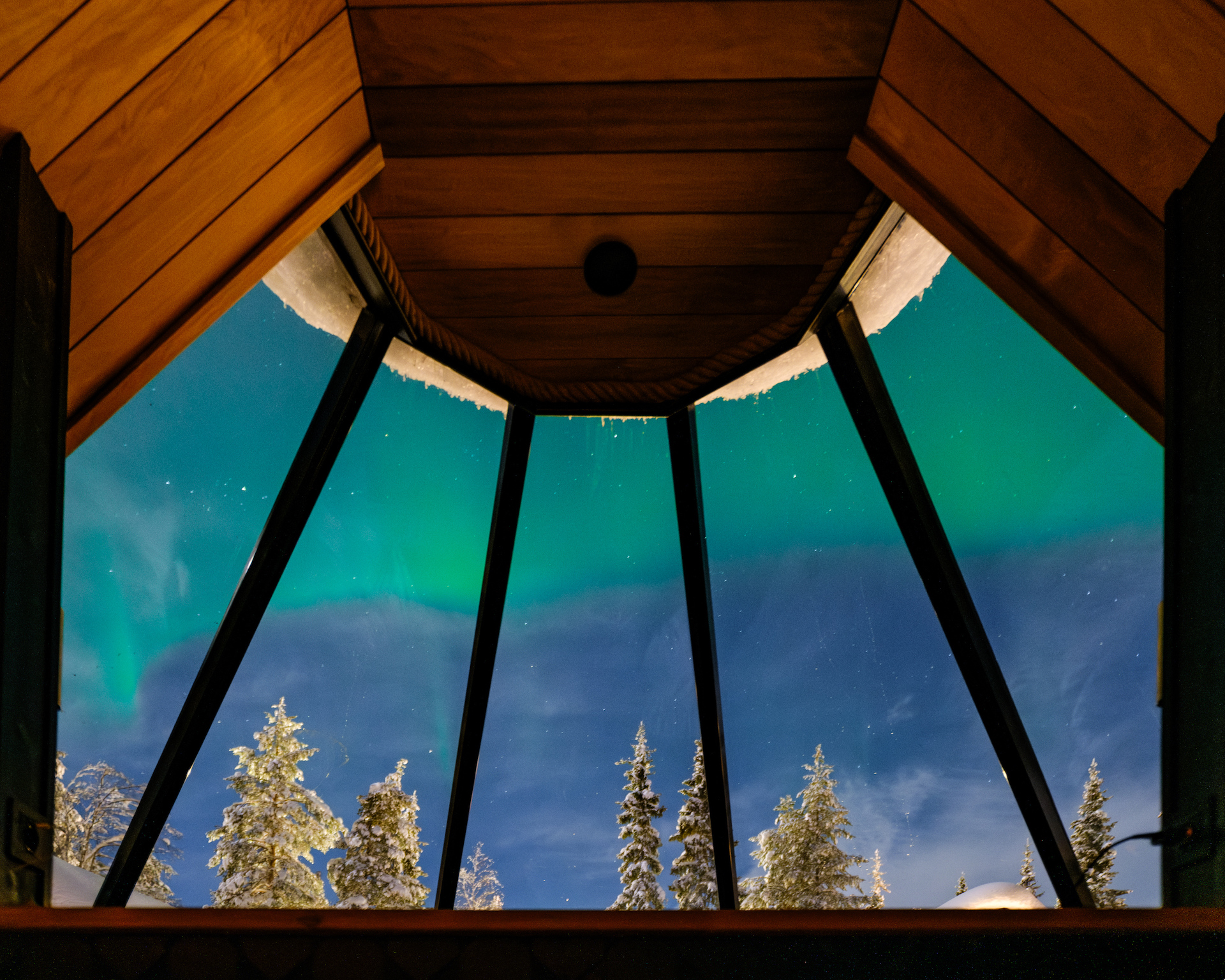 Hidden in a calm forest close to Pyhä–Luosto National Park, Northern Lights Village Pyhä provides a range of cosy accommodation options designed for quiet comfort and sky watching. Guests can choose from the classic Aurora Cabins with heated glass roofs and fireplaces, the larger Sky View Suites with slanted panoramic ceilings and kitchenettes, or the Aurora Suites which add extra space and a private sauna for more comfort. For families or small groups, the Taiga Forest Cabins offer two bedrooms, a private sauna, and a quiet spot deeper in the woods.
