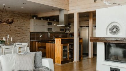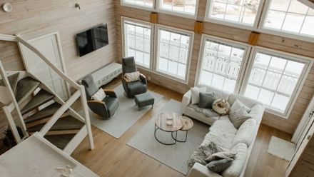 Arcticmint Villa is a modern two-floor property located 25 minutes from Rovaniemi, offering privacy and wide views of Lake Norvajärvi. The villa sleeps up to eight guests across four bedrooms and includes two full bathrooms, a separate toilet, a fully equipped kitchen, a fireplace lounge, and a laundry room. Large windows and open-plan spaces bring in natural light and create a strong connection with the surrounding landscape. A separate dressing and luggage room provides space for outdoor gear.