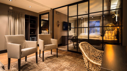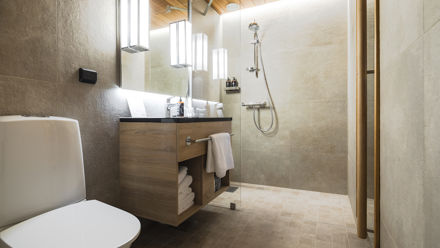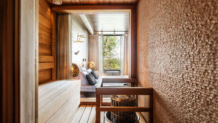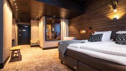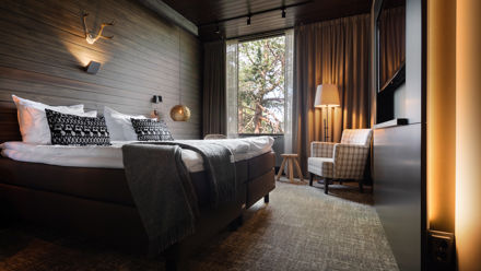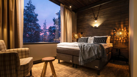 Located on Ounasvaara Hill, just a short drive from Rovaniemi city centre, Sky Ounasvaara is known for its calm setting and sweeping views of the forest and city lights. Rooms are decorated in clean Nordic style with large windows, comfortable bedding, and practical amenities, creating a peaceful atmosphere for couples or nature-loving travellers.