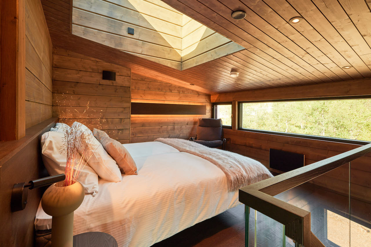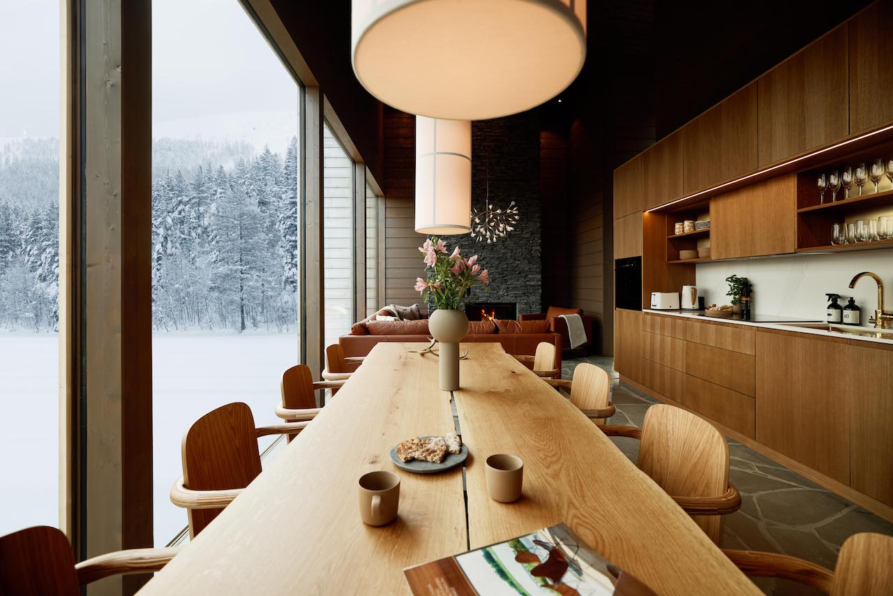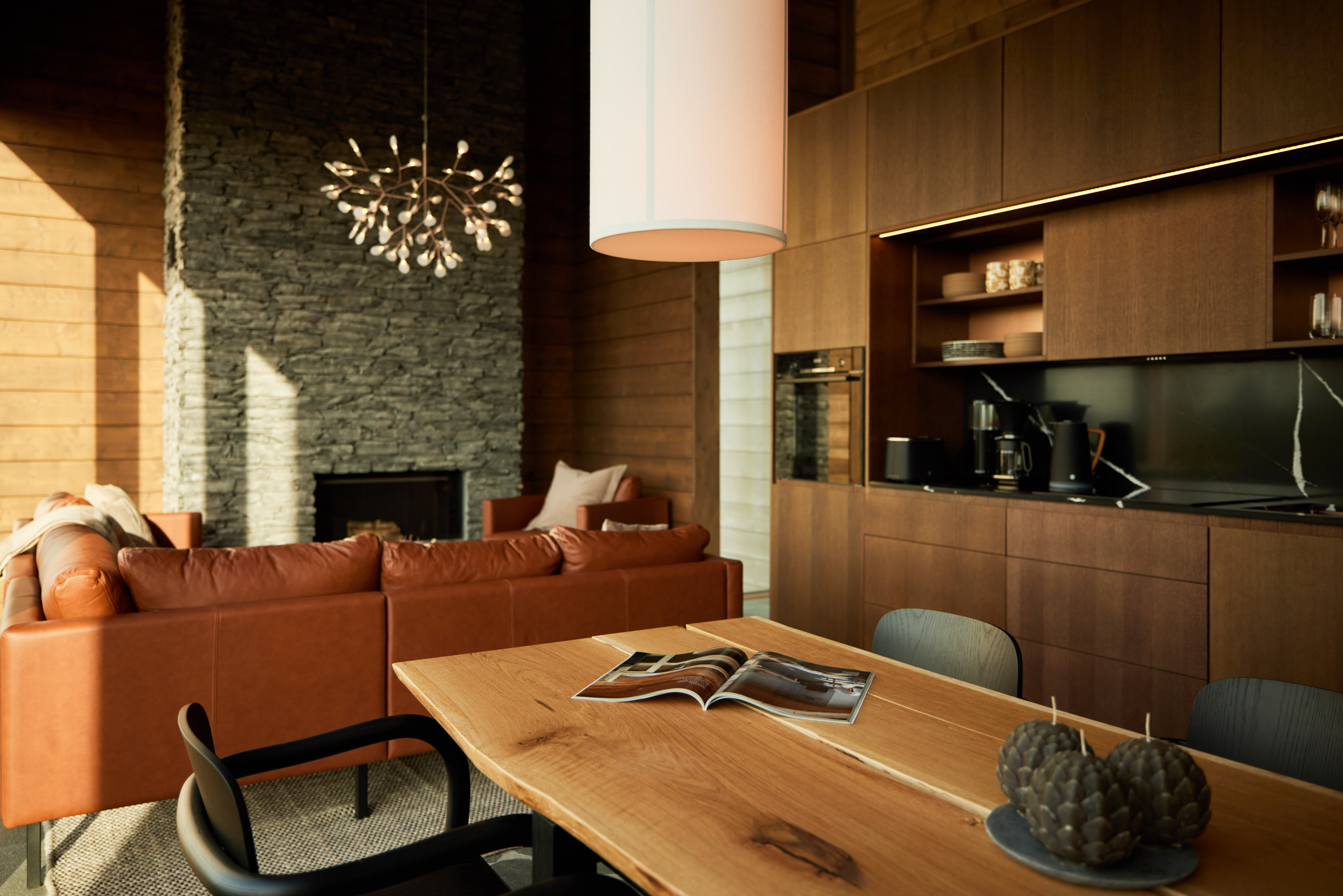 Valo’s exclusive Ice Cube Villas are uniquely designed lodges perched at the edge of Urho Kekkonen National Park. Inside each villa you'll find spacious, contemporary living areas with natural stone floors, solid wood accents, and floor-to-ceiling south-facing windows offering breathtaking fell views. The villas include multiple bedrooms, a full kitchen, and a large terrace with wood-burning fireplace allowing guests to soak in the wilderness ambiance.