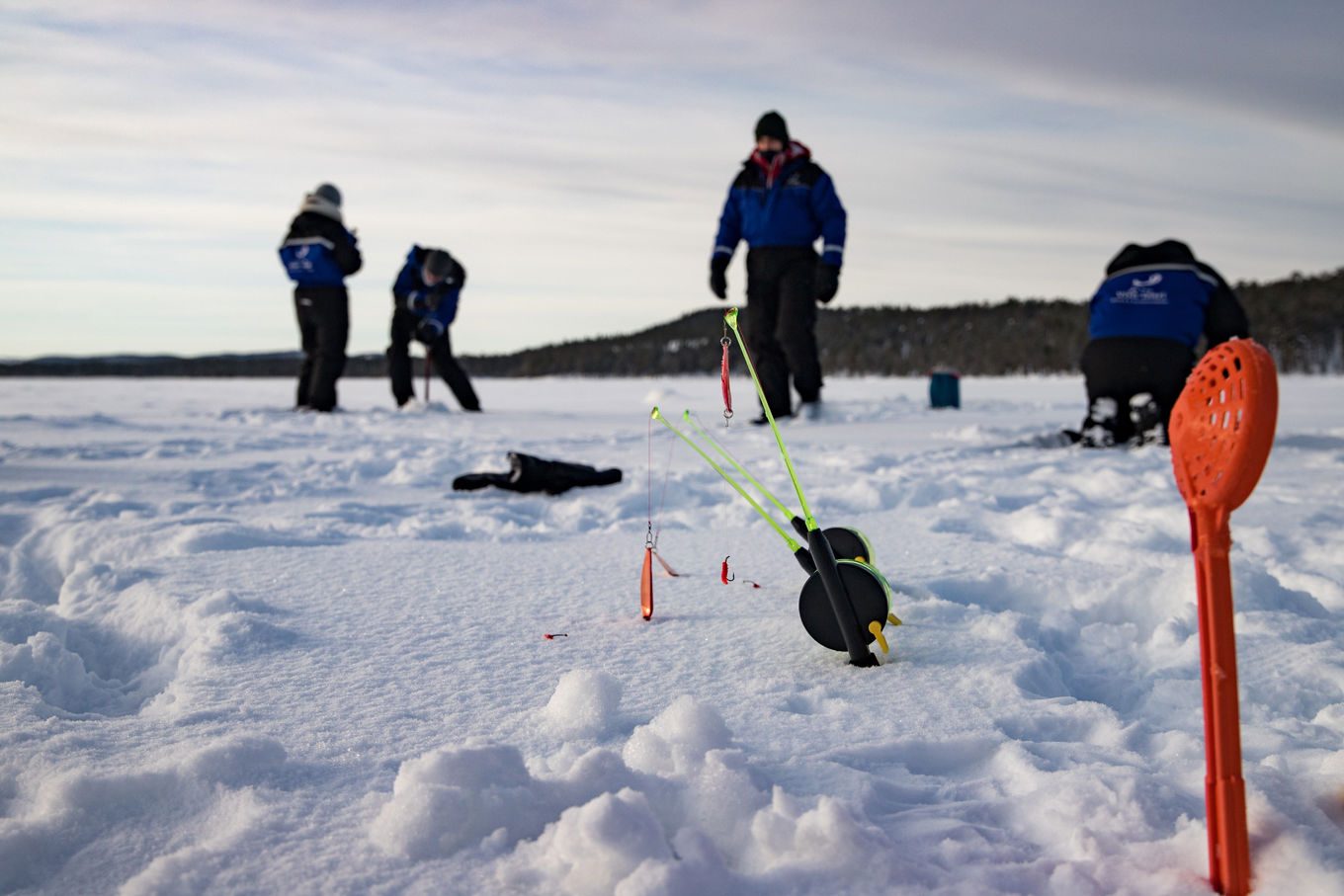 Ice fishing in Lapland is a tranquil experience where you can fish on a frozen lake and enjoy the peaceful Arctic surroundings. Available in small groups or private tours.
