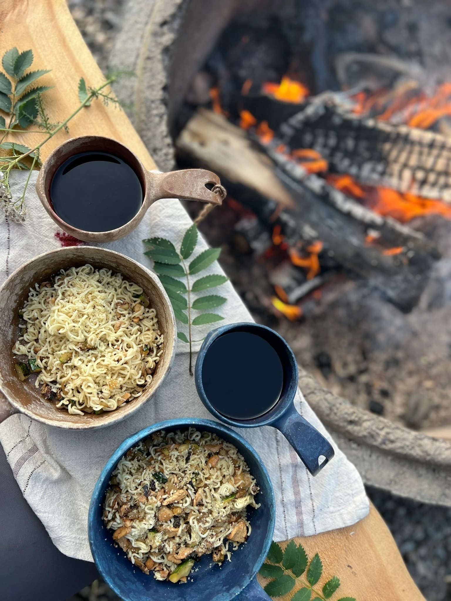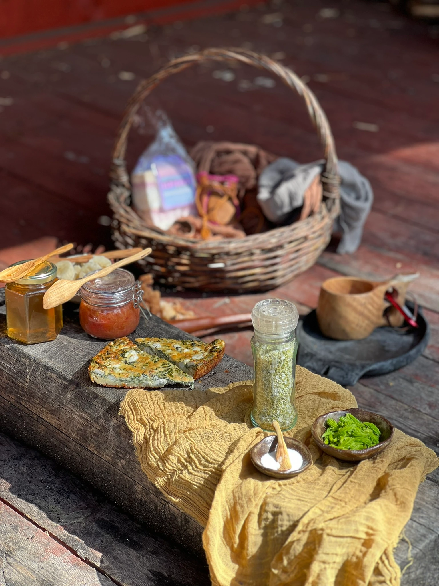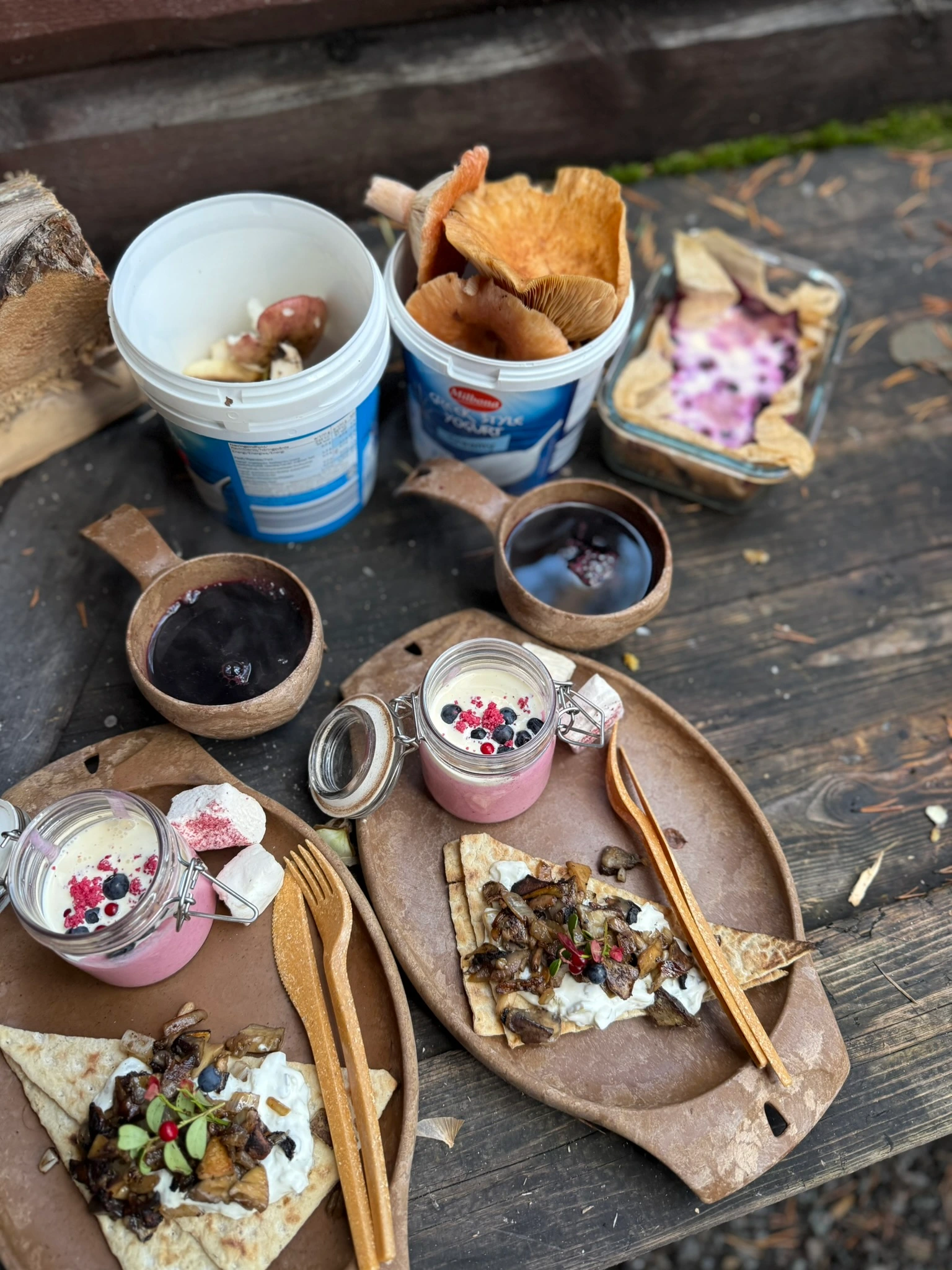 Le menu se compose d’ingrédients frais et saisonniers : légumes, poisson ou viande locaux, baies et herbes sauvages récoltées pendant la balade. Selon la période, vous pourriez fumer du poisson avec des herbes fraîches, préparer une poêlée de champignons ou cuire un pain traditionnel au feu de camp à déguster avec une confiture maison.
