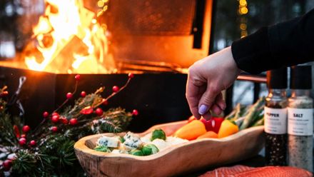 - ארוחת שלוש מנות המוכנה על האש באיגלו זכוכית על שפת אגם