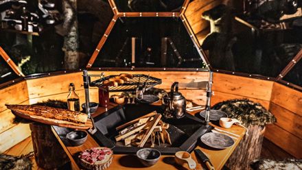 במהלך הערב תוגש ארוחה בת שלושה מנות, המוכנה במקום על האש, מחומרי גלם מקומיים ובשיטות מסורתיות. הקירות והתקרה השקופים מאפשרים תצפית מלאה לשמי הצפון, ואם תנאי מזג האוויר מאפשרים – תוכלו לראות את הזוהר הצפוני היישר ממקומכם.