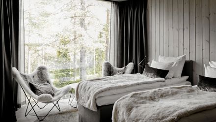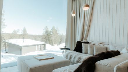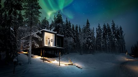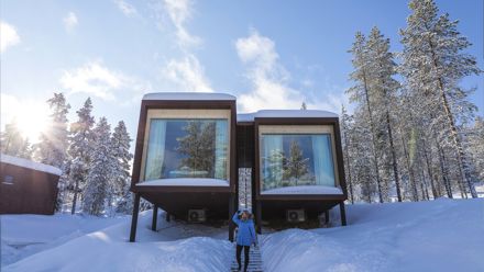 Design-focused suites and glasshouses set on a wooded hillside near Rovaniemi, offering elevated service and beautiful views above the treetops.