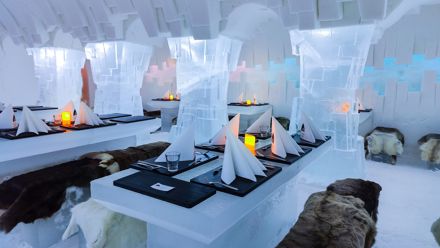 Ice Restaurant Dinner Experience Ice Restaurant Dinner ExperienceEnjoy a unique 3-course dinner at the Arctic SnowHotel's Ice Restaurant, surrounded by breathtaking ice art. Perfect for guests and visitors alike, this is a dining experience like no other.