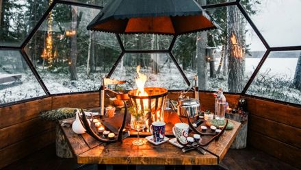 Private Glass Igloo Dinner Private Glass Igloo DinnerThis private evening combines Lapland's natural beauty with warm hospitality in a truly unique setting. Guests are taken to a remote lakeside location, where a glass igloo offers the comfort of indoor dining surrounded by forest and sky.